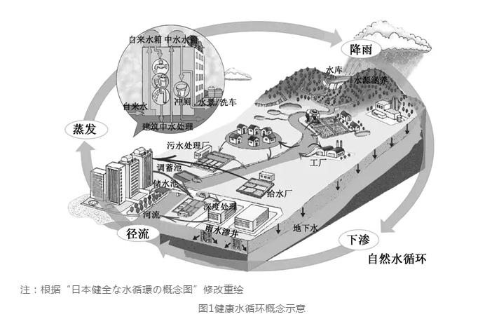 2014年至今,日本城市水系統(tǒng)進入了體系優(yōu)化階段,這一階段最顯著的特點是健康水循環(huán)理念得到前所未有的重視,城市水系統(tǒng)工作從要素治理向系統(tǒng)綜合整治轉(zhuǎn)變。事實上,日本很早就開始重視水循環(huán)的重要作用,2000年制定的《全國綜合水資源計劃》(又稱“21世紀水計劃”)就提出了構(gòu)筑可持續(xù)的用水體系,適應(yīng)循環(huán)型社會發(fā)展的要求,但由于種種原因,這一理念在涉水工作發(fā)展進程中并未被完全落實。隨著日本經(jīng)濟社會發(fā)展模式的轉(zhuǎn)變,人口老齡化和氣候變暖等多種因素的影響,加以城市水資源、水環(huán)境、水安全問題仍舊凸顯,日本的城市規(guī)劃建設(shè)者開始意識到城市水系統(tǒng)是城市復(fù)雜大系統(tǒng)的重要組成部分,涉及城市水資源開發(fā)利用、水環(huán)境治理保護、水安全保障提升等全要素全過程,局部的涉水工作難以解決整體問題,需要用系統(tǒng)的思維來認識和分析面臨的水問題,以城市為核心構(gòu)建健康水循環(huán)才能實現(xiàn)城市水系統(tǒng)對經(jīng)濟社會的永續(xù)支撐(見圖1)。