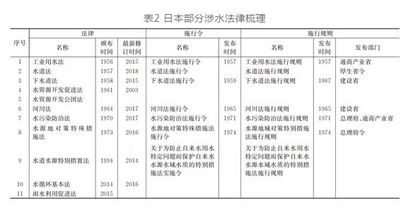 日本的法律體系可以分為憲法、法律、政令、省令和通達5個層次。通過國會頒布法律、內(nèi)閣頒布政令以及省頒布省令,對涉水工作進行全面的規(guī)定(見表2)。例如國會頒布《河川法》,內(nèi)閣負責發(fā)布《河川法施行令》,主管河道的國土交通省負責發(fā)布《河川法施行規(guī)則》。整個法律體系層次清晰、責任明確、詳略互補,全方位指導涉水工作的開展。日本城市水系統(tǒng)相關(guān)法律較為豐富,核心的涉水法律有《河川法》《水資源開發(fā)促進法》《水道法》《下水道法》《水污染防治法》等10余部,覆蓋了河流水系、水資源、供水、用水、排水、水環(huán)境和健康水循環(huán)理念等水系統(tǒng)多角度、全要素的內(nèi)容。日本涉水法律內(nèi)容詳盡,明確涉水工作的責任主體、職能分工、協(xié)調(diào)機制,部分法律還對技術(shù)標準進行詳細規(guī)定,例如《水道法》將水質(zhì)基準的內(nèi)容納入法律框架體系,強化了標準執(zhí)行力度。日本涉水法律體系修訂更新周期短,如有必要最短1年時間即可開展法律修訂,例如《下水道法》在2005年、2011年和2015年分別針對城市內(nèi)澇、事權(quán)改革、雨水公共下水道建設(shè)問題開展修訂,極大的保障了法律的適應(yīng)性。