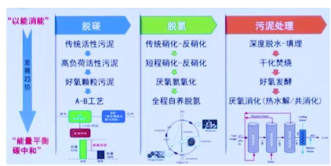 圍繞工藝的轉變,污水處理技術要從“以能消能”到能量平衡、“碳中和”轉變。其中,脫碳體系要重點關注a-b法和整體營養物回收,這是主流工藝的未來;脫氮方面,主要聚焦自養脫氮技術;此外,污泥處理,從傳統的脫水-填埋到碳化、能源化轉變,在碳中和形勢下會有巨大潛力。