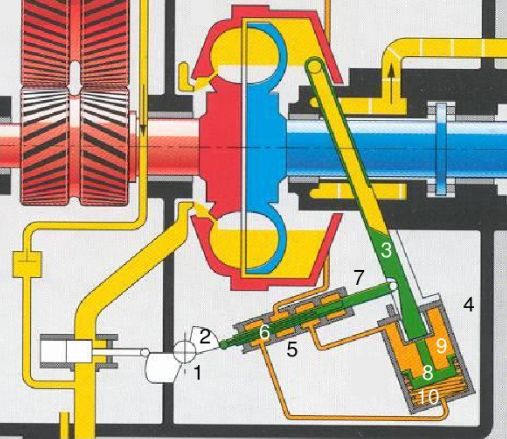 1執行器 2凸輪 3勺管 4定位油缸 5控制閥 6控制閥芯 7控制導向套 8 勺管位置 9腔1 10腔2