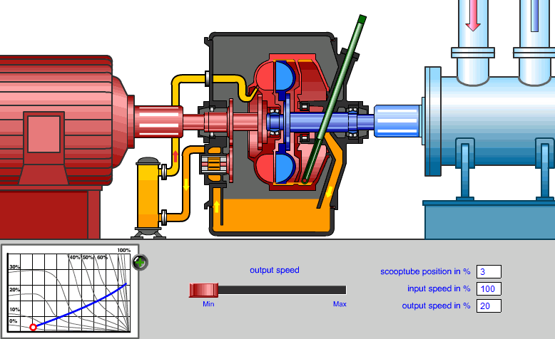 傳說中的無級變速是怎么實現的呢,有一個神奇的裝置是勺管,運行人員通過在dcs中調節勺管的開度就可以改變給水泵的轉速,從而改變給水量。改變勺管的開度,最終目的是改變液力耦合器內的工作油流量,從而改變傳動的力矩和滑差(泵輪與渦輪的轉速差),最終按照工況的要求驅動電動給水泵。當勺管深到工作腔最底部時(0%的位置),工作腔的工作油最少,這時的輸出速度最低。當勺管移出(100%的位置),腔內的工作油最多,這時的輸出速度最大。